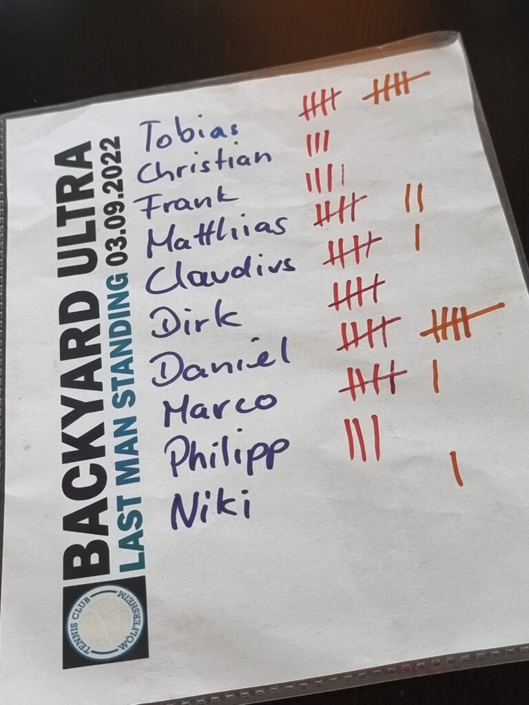 Entstanden aus einem Gespräch am Lagerfeuer und ein paar Bierchen wenige Wochen zuvor, startete am letzten Samstag der hessischen Sommerferien pünktlich um 9 Uhr ein kleiner Trupp von neun Läufern auf dem Gelände des Tennisclub Wölfersheim in das Abenteuer Backyard Ultra, die meisten davon Rookies und Hobbyläufer mit wenigen Wochenkilometern. Gelaufen wurde nach den Regeln des amerikanischen Originals, jedoch mit zwei Abwandlungen: nach schwedischer Regel sollte es auch ein Sieger geben, wenn zwei die gleiche Rundenzahl absolviert haben (dann sollte der schnellere auf der letzten Runde den Sieg bekommen) und es waren auch weitere Teilnehmer erlaubt, die später einsteigen, allerdings dann nicht um den Sieg kämpfen durften.